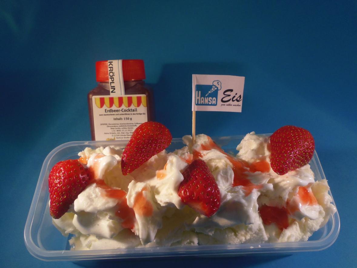 3 x 100 g Joghurt Eispulver und 1 Dose 150 g Erdbeer-Cocktail (alkoholfrei), zum Unterrühren in das fertige Eis