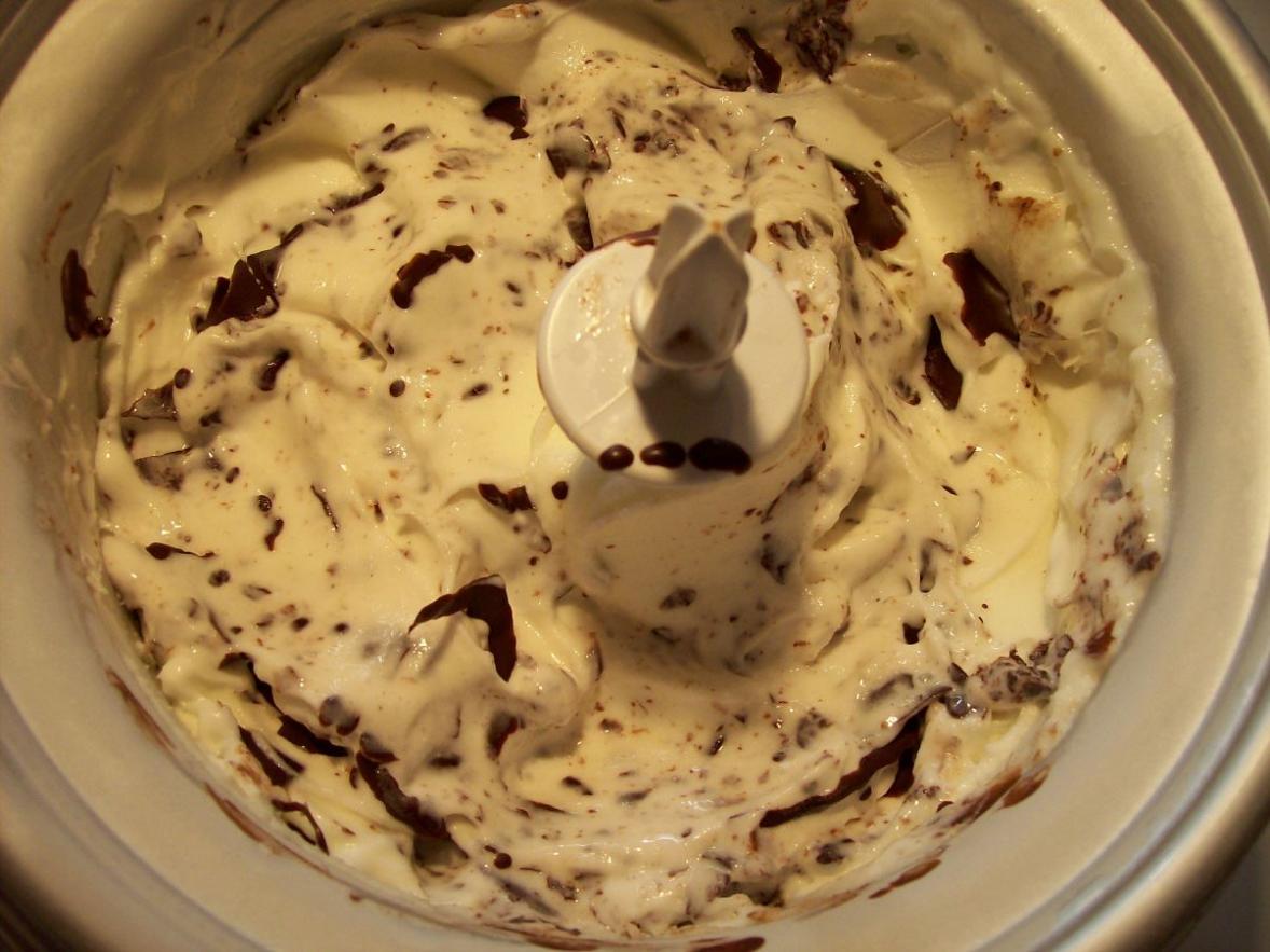 4. nach ca. 20 bis 40 Minuten Rührbetrieb in der Haushaltseismaschine ist das Speiseeis fertig.